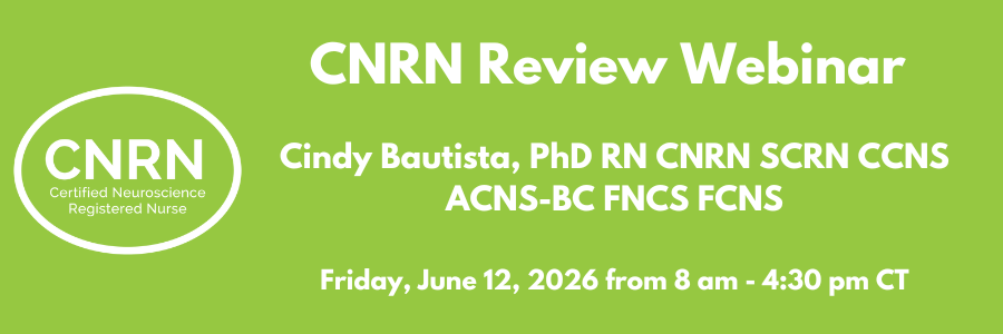 Join us on Friday, June 12, 2026 from 8am-4:30pm CT (6 am PT/ 7 am MT/ 9 am ET) on Zoom for the live CNRN Review Webinar taught by Cynthia Bautista, PhD RN ACNS-BC CCNS CNRN SCRN FNCS. Participate in the CNRN Review Webinar to better understand your current knowledge as it applies to the certification and determine where additional studies are needed. This webinar is not exhaustive of the material on the CNRN exam, but rather a highlight of the information.